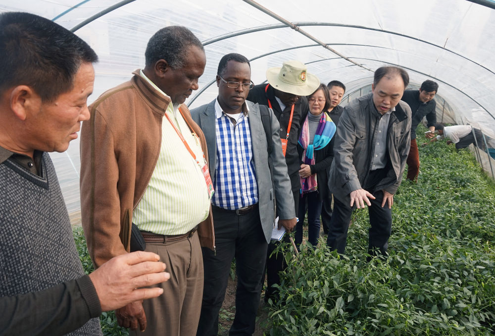 在中國江西省鄱陽湖湖區(qū),來自非洲維多利亞湖區(qū)的學員在一處蔬菜大棚種植基地考察(2014年攝)。