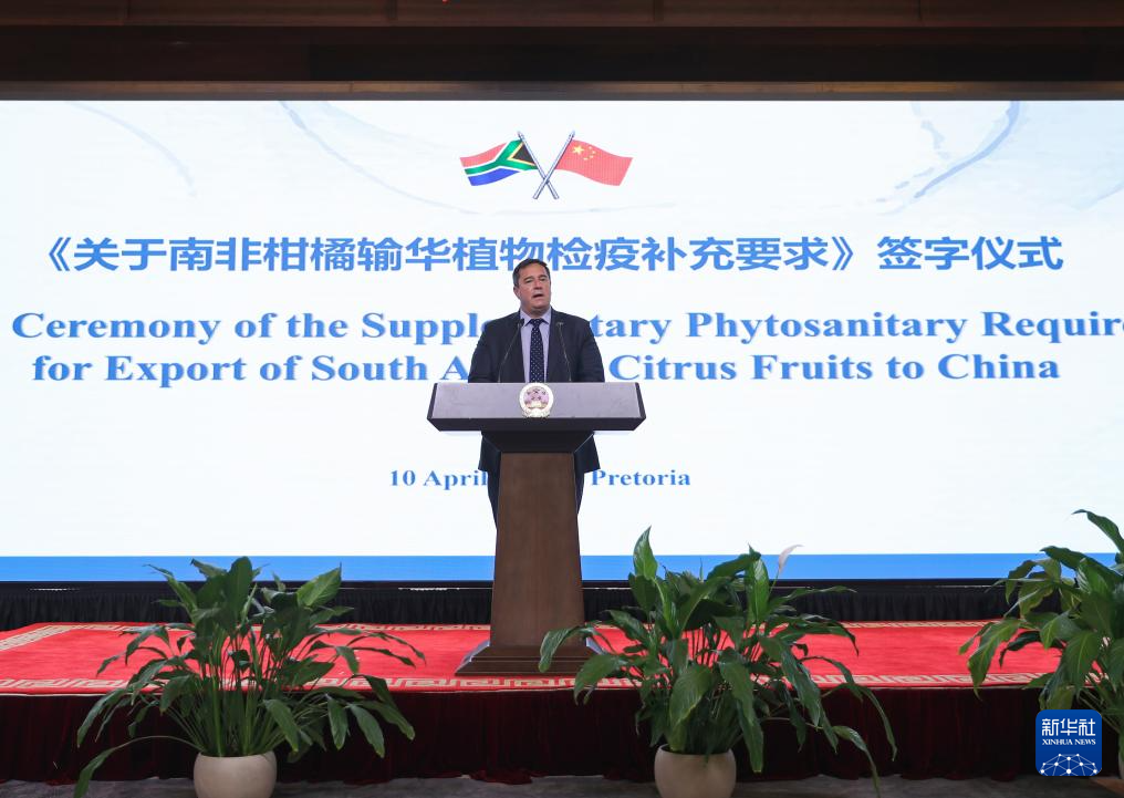 4月10日,在南非比勒陀利亞,南非農(nóng)業(yè)部長斯廷黑森在《關(guān)于南非柑橘輸華植物檢疫補(bǔ)充要求》簽字儀式上致辭。新華社記者 陳為 攝