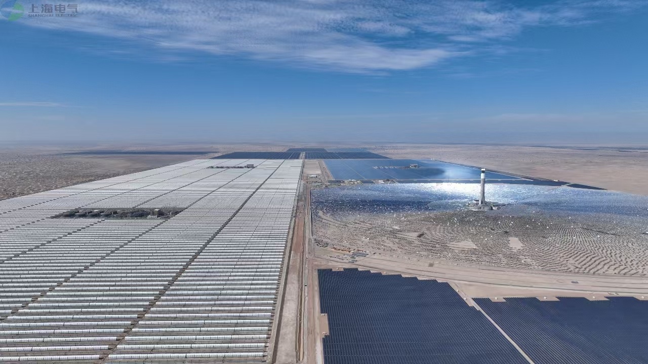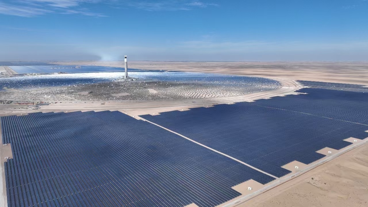 在阿拉伯聯(lián)合酋長(zhǎng)國(guó)迪拜的沙漠深處,一片蔚藍(lán)的光伏板“海洋”在烈日下熠熠生輝:巍然聳立的262米集熱塔與周?chē)s7萬(wàn)面定日鏡組成的巨大鏡場(chǎng),共同構(gòu)成全球規(guī)模最大的光熱光伏復(fù)合電站。6000多套槽式集熱器在相當(dāng)于6000多個(gè)標(biāo)準(zhǔn)足球場(chǎng)面積的園區(qū)中協(xié)同運(yùn)作,捕捉沙漠中充沛的太陽(yáng)能,并將其源源不斷轉(zhuǎn)化為清潔電能。