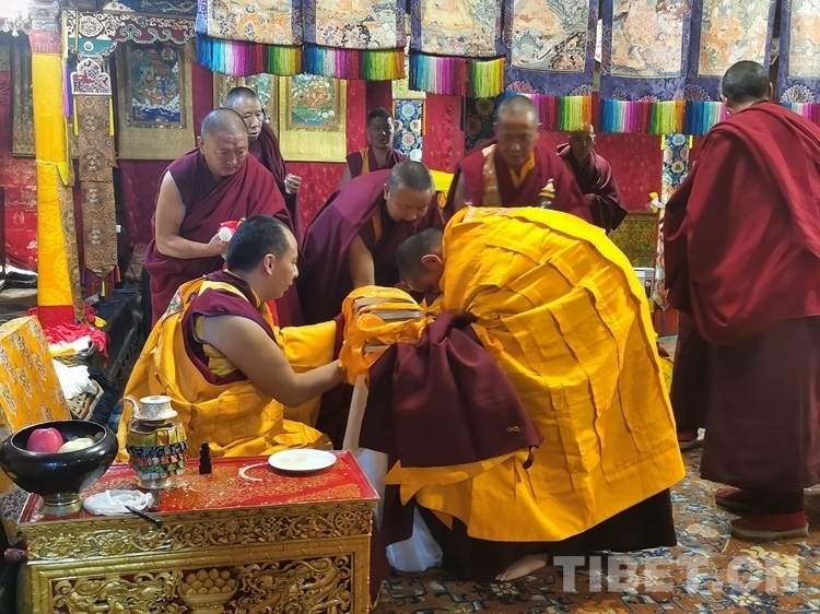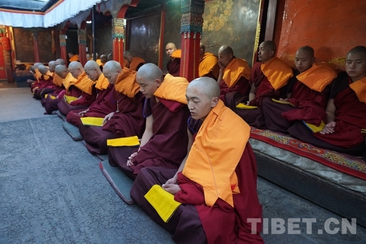 當(dāng)天清晨,扎什倫布寺桑煙繚繞、法號聲聲,28 位受戒的年輕僧人帶著新制袈裟,迎著朝霞依次走向拉讓殿等待班禪授戒這一神圣時刻的到來。8時許,在手持黃傘、香爐和吹嗩吶的高僧護(hù)送引領(lǐng)下班禪緩緩步入拉讓殿,并與在場僧眾集體誦經(jīng)。誦經(jīng)儀式結(jié)束后,班禪就坐于拉讓殿寶座,4名高僧大德作為授戒眾,開始為僧人閉門授戒、剃度、賜法名、摸頂。此時,受戒僧人一一入座,兩手在胸前交叉,聽班禪引證經(jīng)典告誡,并宣誓嚴(yán)守戒律。