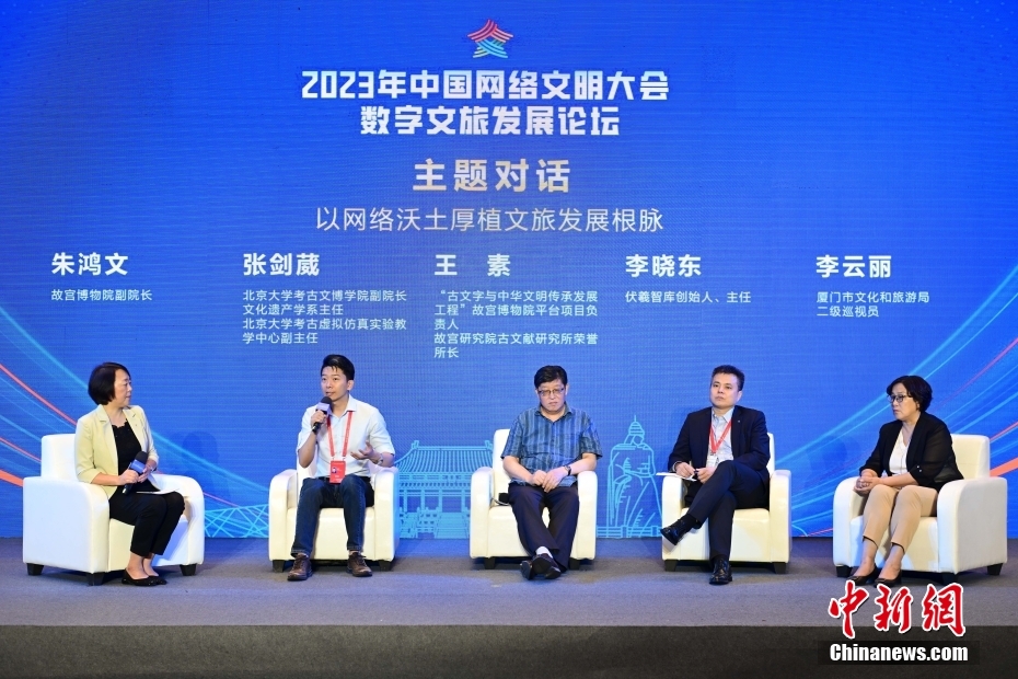 7月19日,2023年中國網(wǎng)絡(luò)文明大會數(shù)字文旅發(fā)展論壇在福建省廈門市舉辦。論壇以“數(shù)字鏈接古今 網(wǎng)絡(luò)貫通世界”為主題,邀請國內(nèi)外數(shù)字化、文博考古、旅游等領(lǐng)域?qū)<液痛砉餐剿鞴偶奈镌跀?shù)字時代的創(chuàng)造性轉(zhuǎn)化和創(chuàng)新性發(fā)展,以及在數(shù)字技術(shù)賦能下,文旅產(chǎn)業(yè)如何實現(xiàn)高質(zhì)量發(fā)展。圖為論壇現(xiàn)場。中新社記者 田雨昊 攝