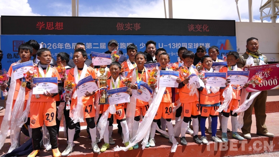 那曲市色尼區(qū)第二屆U-13校園足球聯(lián)賽頒獎(jiǎng)儀式上,冠軍隊(duì)伍合影。