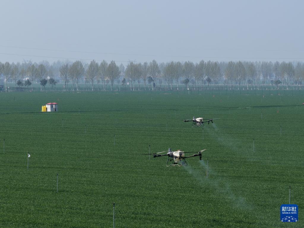4月1日,飛防無人機在河南周口國家農高區(qū)小麥高產創(chuàng)建示范田作業(yè)(無人機照片)。新華社記者 李嘉南 攝