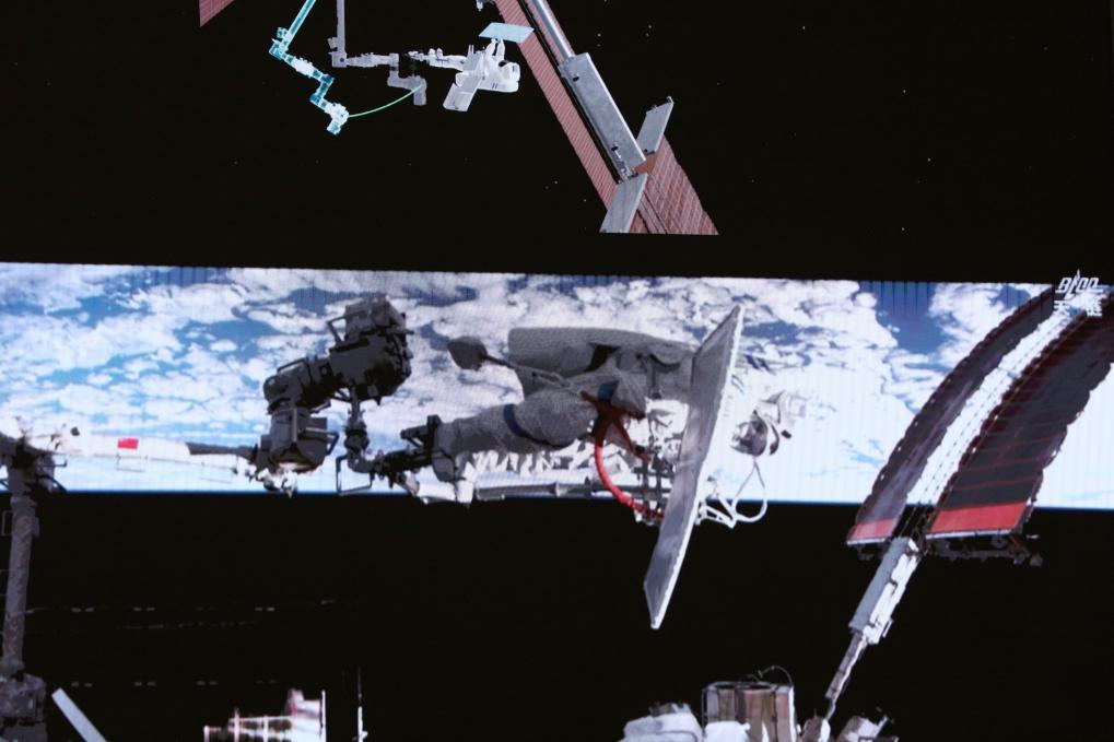 這是2026年4月16日在北京航天飛行控制中心屏幕上拍攝的神舟二十一號(hào)乘組航天員武飛在艙外工作的畫(huà)面。