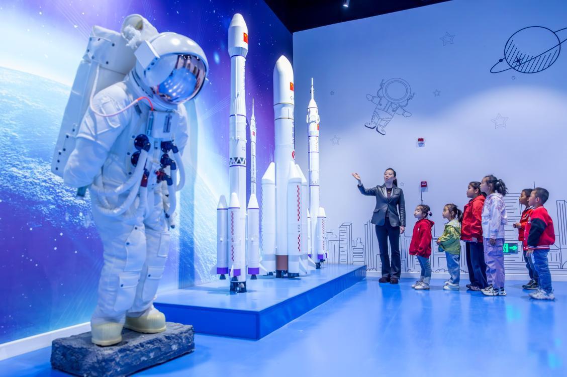 2026年4月23日,甘肅張掖,孩子們?cè)诳萍拣^航天科普展廳近距離參觀長(zhǎng)征系列火箭模型。