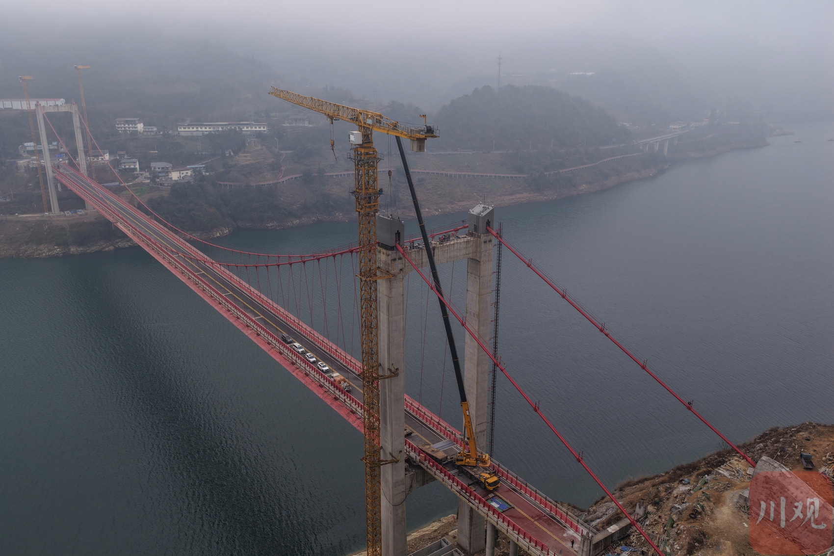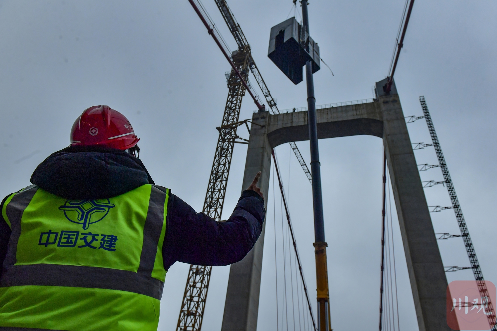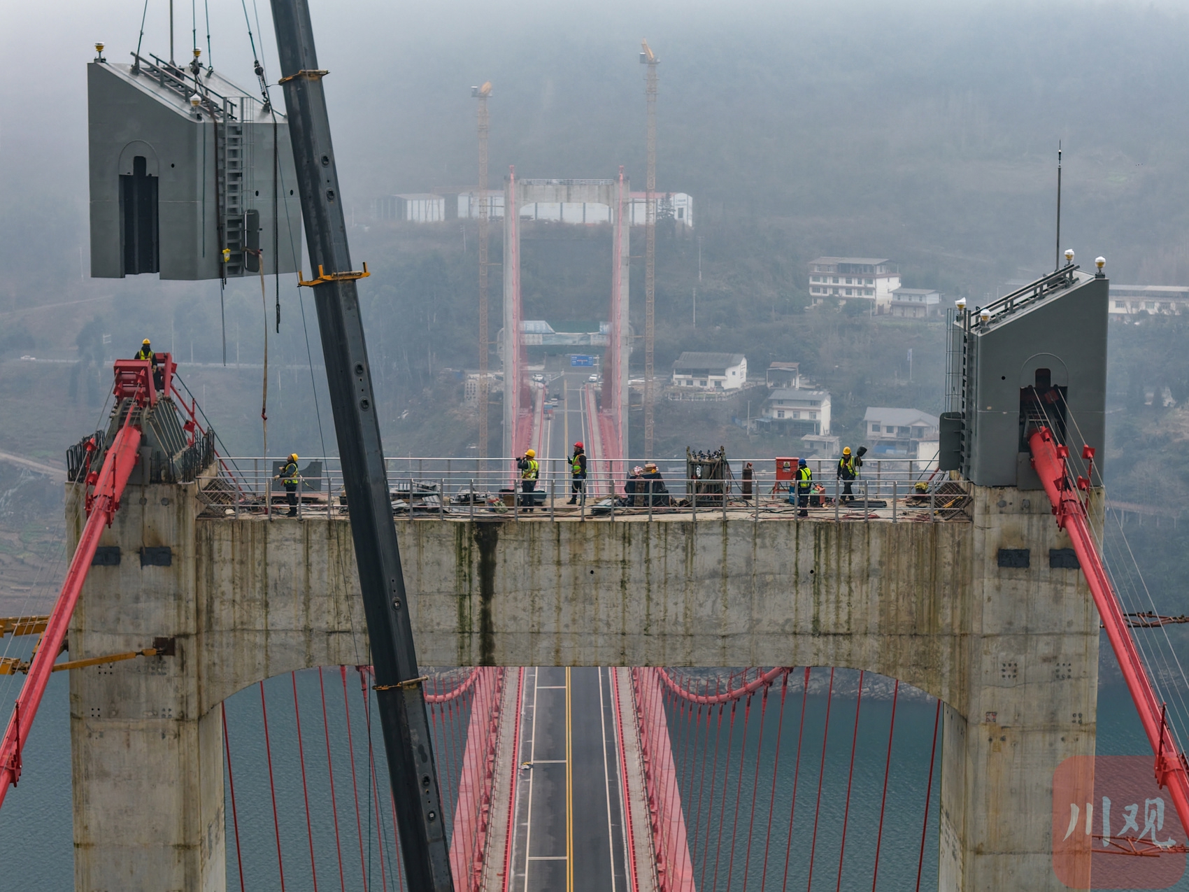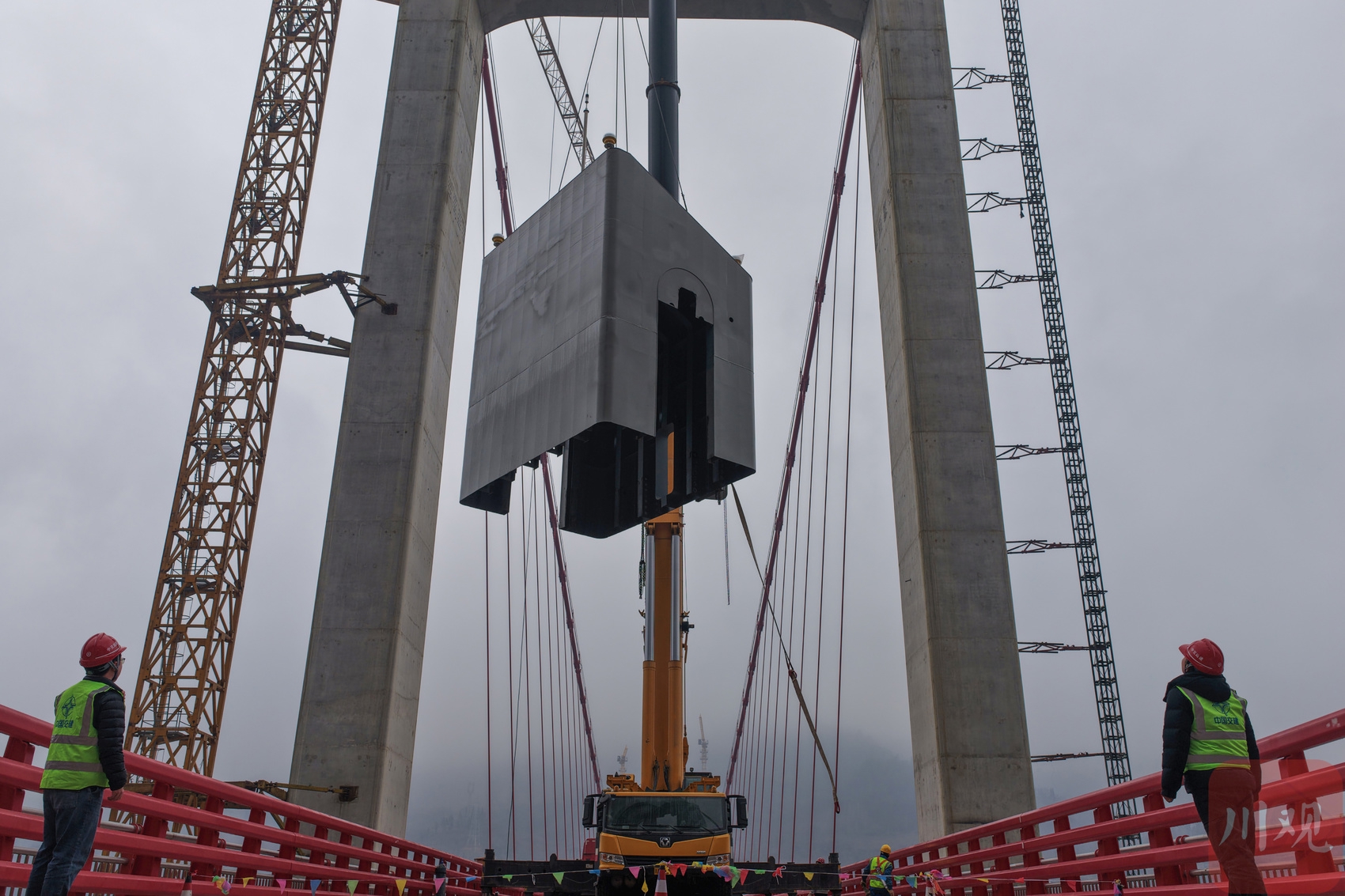 2026年1月19日,國道317線友誼隧道至汶川映秀段改建工程紫坪鋪特大橋施工現(xiàn)場,工人正在大橋主塔塔冠吊裝。