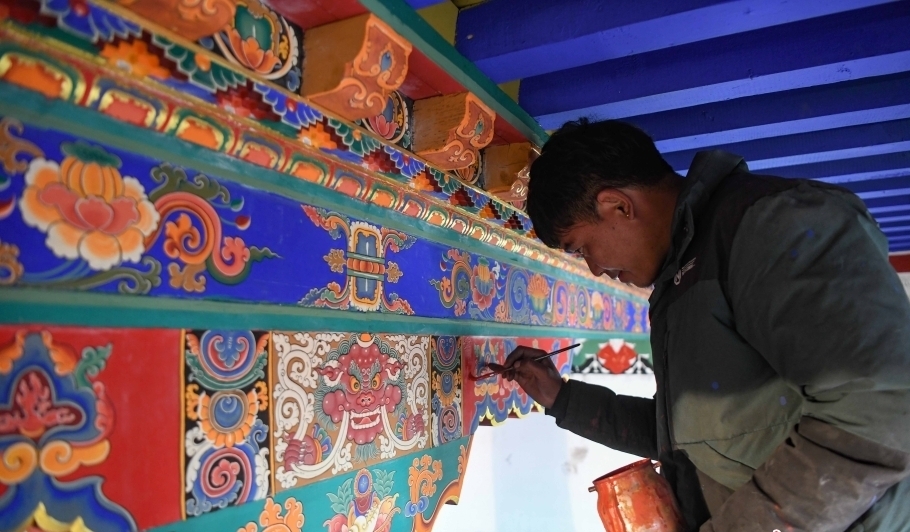 12月28日,西藏拉薩堆龍德慶區(qū),古俗民族傳統(tǒng)手工藝發(fā)展專業(yè)合作社員工在房屋上繪制藏式裝飾。[詳細] -