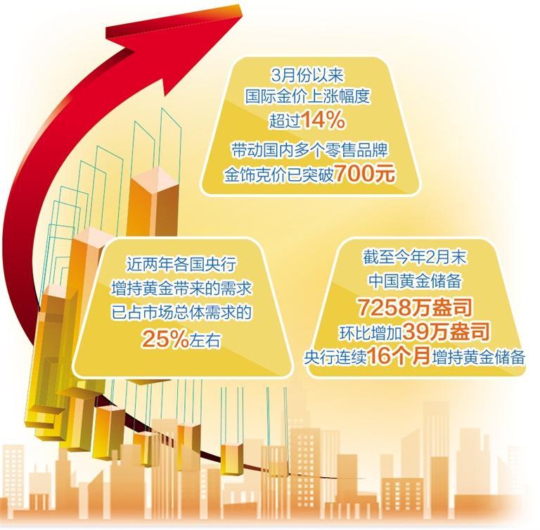 市場分析人士認為,今年以來,在美聯(lián)儲貨幣政策確定轉向的背景下,疊加近期地緣政治沖突激化,以及全球多國央行對黃金的持續(xù)需求,多因素共同推動了國際金價的強勁上漲。