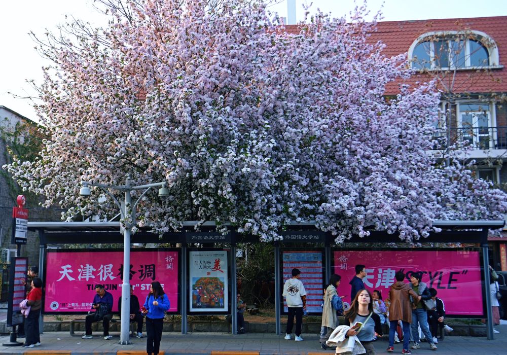 位于天津五大道馬場(chǎng)道的天津外國(guó)語(yǔ)大學(xué)公交站旁的海棠花盛開(kāi)(4月6日攝)。