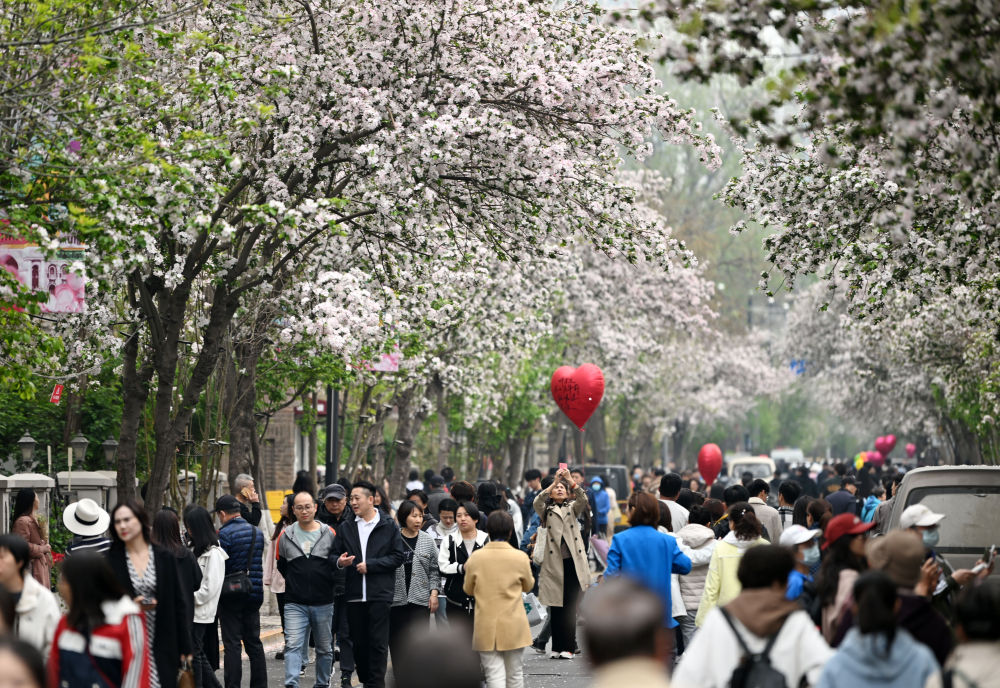 游客在海棠花盛開(kāi)的五大道大理道上漫步休閑(4月7日攝)。
