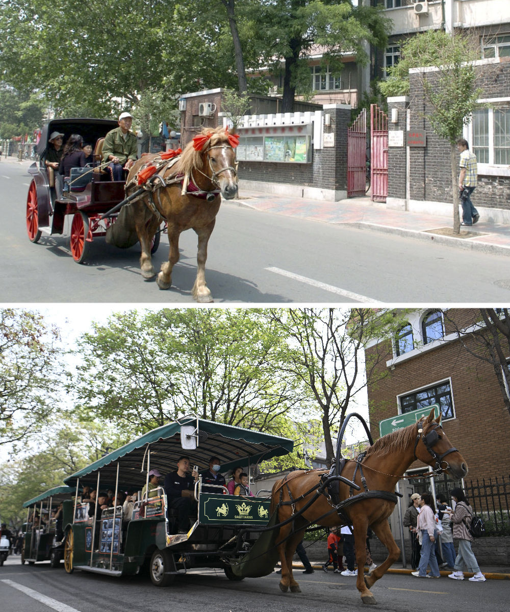拼版照片:上圖是游客乘坐四輪馬車(chē)游覽天津五大道(2005年6月2日攝);下圖是游客乘坐觀光馬車(chē)游覽天津五大道(2024年4月13日攝)。