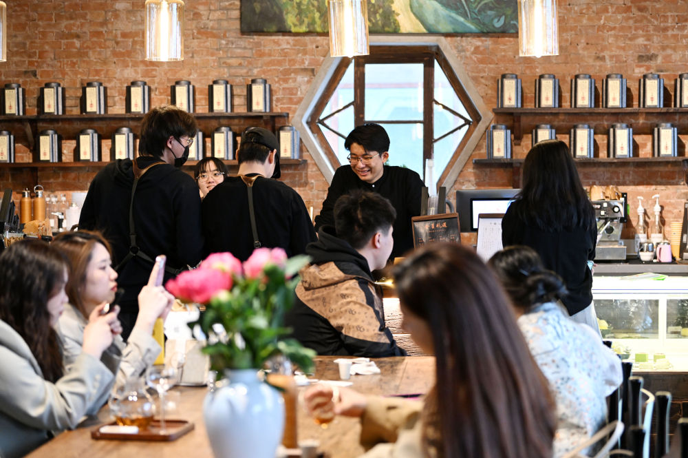 在天津市和平區(qū)五大道,一家新開(kāi)業(yè)的茶飲店內(nèi)顧客絡(luò)繹不絕(4月10日攝)。