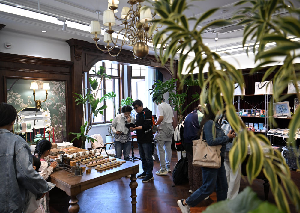 游客在五大道中的一家藝術(shù)品商店內(nèi)選購(gòu)(4月13日攝)。