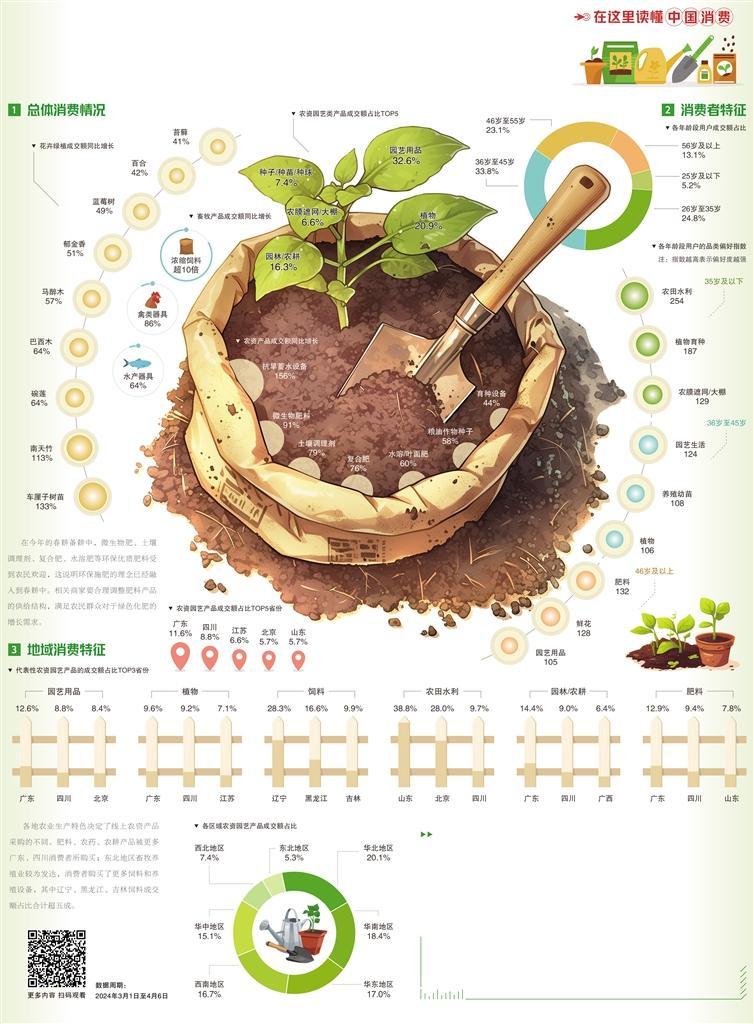 此外,畜牧業(yè)生產(chǎn)、城市花草種植需求也成為春耕消費(fèi)的新亮點(diǎn)。鄉(xiāng)村養(yǎng)殖戶抓住春季時(shí)節(jié)推進(jìn)畜禽填槽補(bǔ)欄,濃縮飼料、禽類器具、水產(chǎn)器具成為受歡迎的產(chǎn)品,其中濃縮飼料的成交額同比增長(zhǎng)超10倍。城市居民購買了更多的花卉綠植,為自家陽臺(tái)、花園、辦公室增添濃濃春意,車?yán)遄訕涿?、南天竹、巴西木、郁金香是最受青睞的品類。
