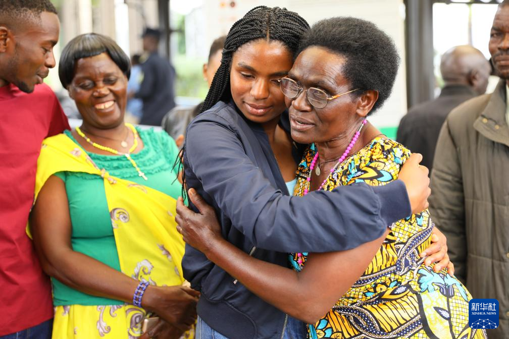 4月23日,在盧旺達首都基加利國際機場,一名來自盧旺達北方省穆桑澤職業(yè)技術(shù)學(xué)院的學(xué)生與母親擁抱告別。新華社記者 吉莉 攝