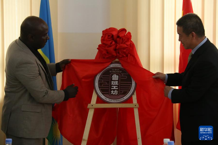 2023年11月18日,在盧旺達北方省穆桑澤職業(yè)技術(shù)學(xué)院,中國駐盧旺達大使王雪坤(右)與盧旺達北方省省長莫里斯·穆加博瓦加洪德共同為盧旺達魯班工坊揭牌。新華社發(fā)(黃萬晴攝)