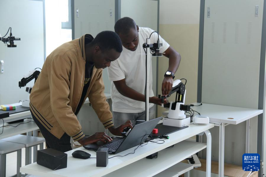 2023年11月18日,在盧旺達北方省穆桑澤職業(yè)技術(shù)學(xué)院魯班工坊的實驗室中,兩名當(dāng)?shù)貙W(xué)生操作儀器。新華社發(fā)(黃萬晴攝)
