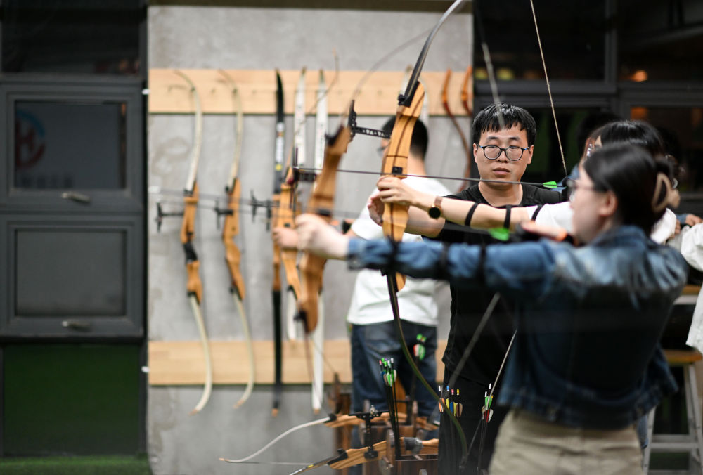 ↑4月25日,在天津市璽元銳鋒射箭俱樂(lè)部,學(xué)員在河西區(qū)青年夜校射箭課上體驗(yàn)射箭運(yùn)動(dòng)。