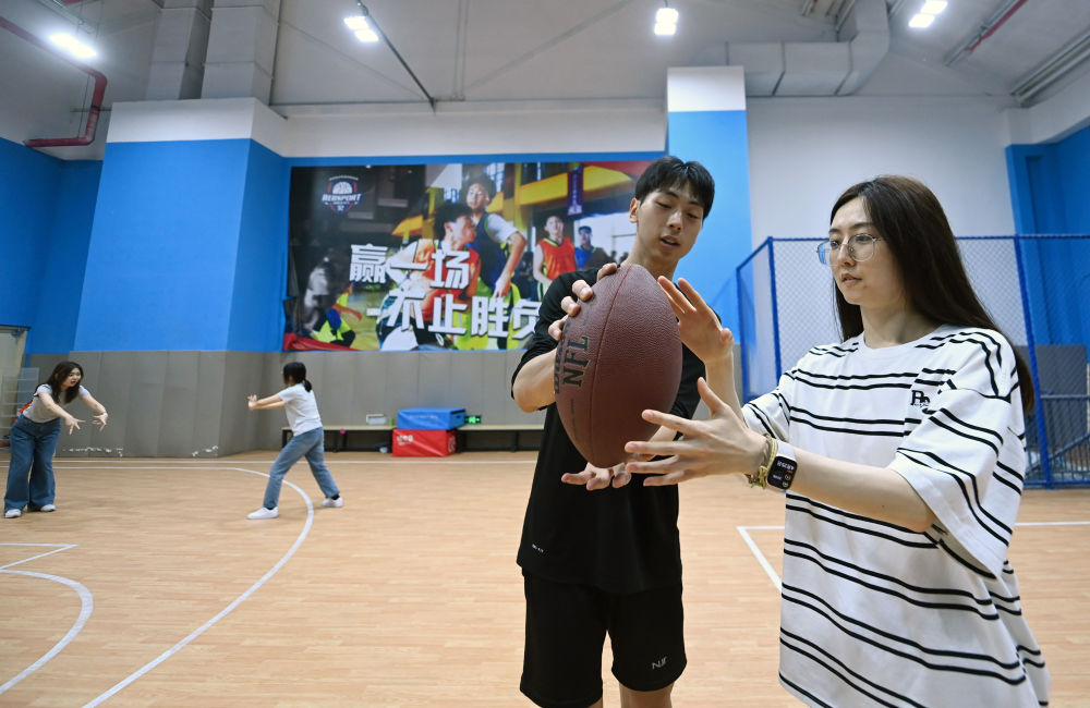 ↑4月25日,在天津市南開(kāi)區(qū)瑞步青少年籃球俱樂(lè)部,南開(kāi)區(qū)青年夜校教師指導(dǎo)學(xué)員練習(xí)腰旗橄欖球。