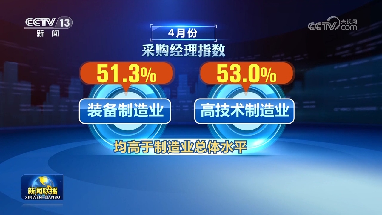 新動能繼續(xù)較快擴張。4月份裝備制造業(yè)和高技術(shù)制造業(yè)采購經(jīng)理指數(shù)分別為51.3%和53.0%,均高于制造業(yè)總體水平。
