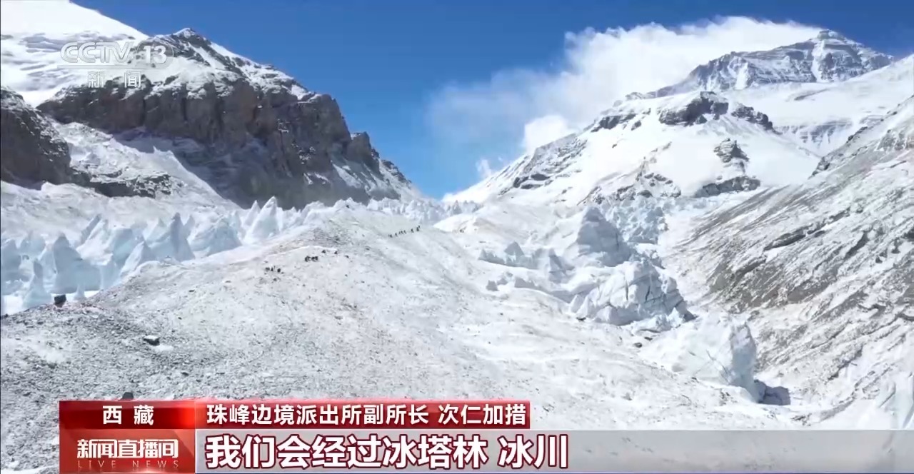 珠峰邊境派出所副所長 次仁加措:往里走的話我們會經(jīng)過冰塔林、冰川,穿越碎石灘,整個路途我們會花費8到12個小時,途中經(jīng)過老大本營,那個地方是最危險的路段。