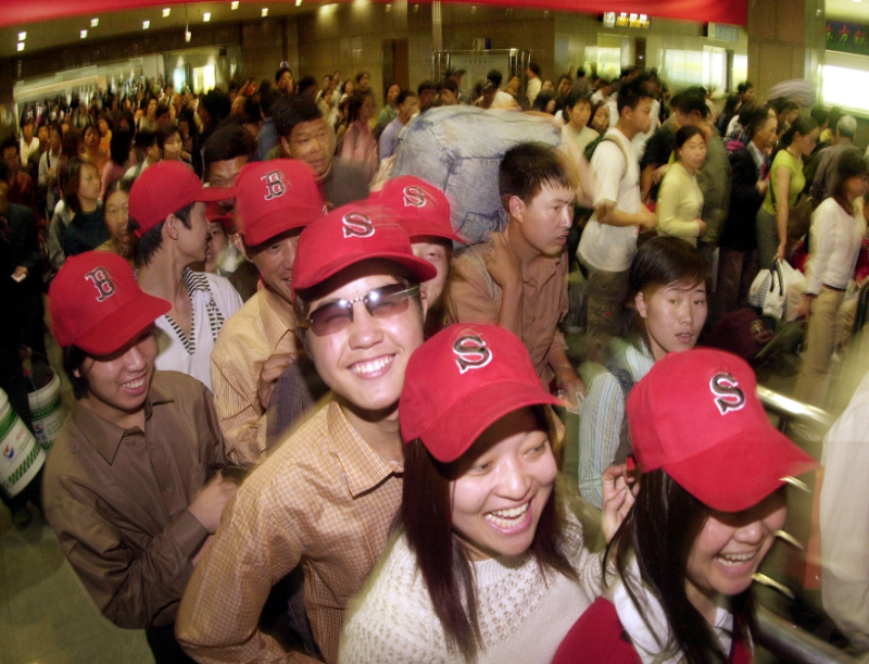 2004年5月1日,在杭州火車站出口處,大批旅行團(tuán)游客準(zhǔn)備出站。“五一”期間,來自全國(guó)各地的大批游人通過鐵路和公路涌入杭州,形成旅游高峰。新華社發(fā)(李震宇 攝)