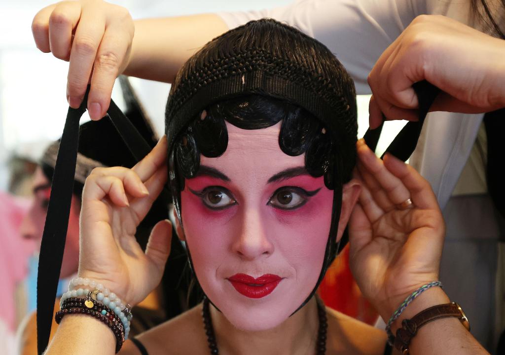 2023年9月9日,在法國巴黎中國文化中心,法國觀眾體驗昆曲旦角扮相。新華社記者高靜 攝