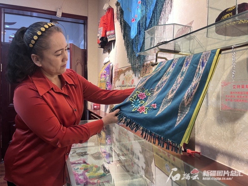 哈密刺繡國(guó)家級(jí)代表性傳承人阿加汗·賽買提家,不僅有刺繡工廠,還有一個(gè)展示哈密刺繡的展廳。石榴云/新疆日?qǐng)?bào)記者 王晶晶攝
