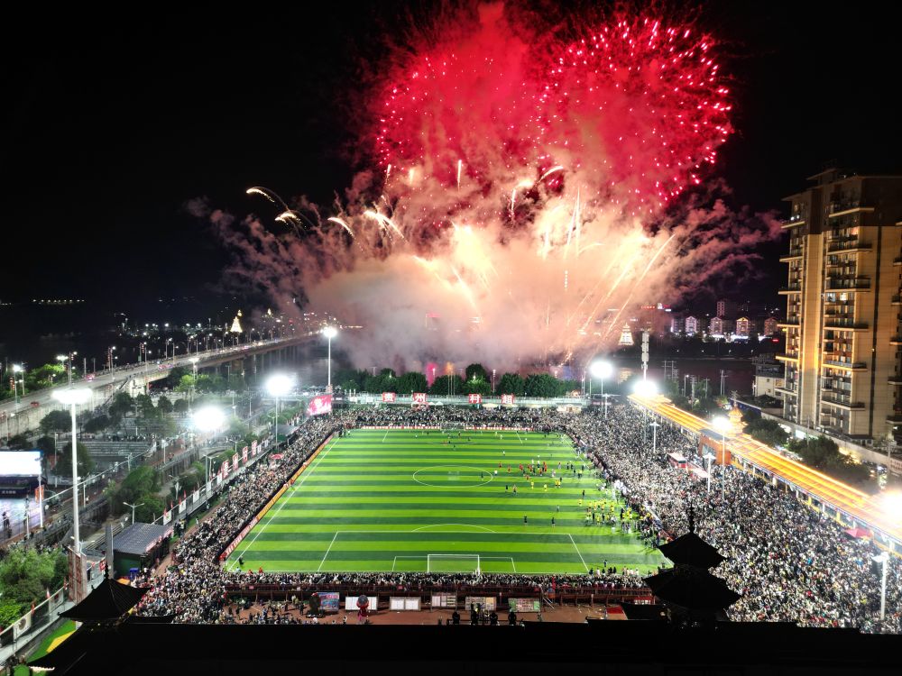 5月4日,游客在貴州省黔東南苗族侗族自治州榕江縣“村超”球場比賽結(jié)束后欣賞焰火表演(無人機(jī)照片)。新華社發(fā)(王炳真 攝)