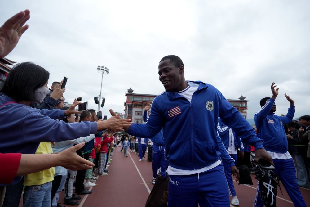 5月1日,貴州省黔東南苗族侗族自治州榕江縣“村超”球場,來自非洲利比里亞社聯(lián)足球隊(duì)球員與群眾互動(dòng)。新華社發(fā)(王炳真 攝)