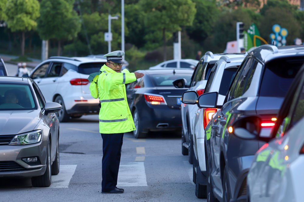 5月4日,民警在貴州省黔東南苗族侗族自治州丹寨縣萬達(dá)小鎮(zhèn)為游客指揮交通。新華社發(fā)(陸德華 攝)