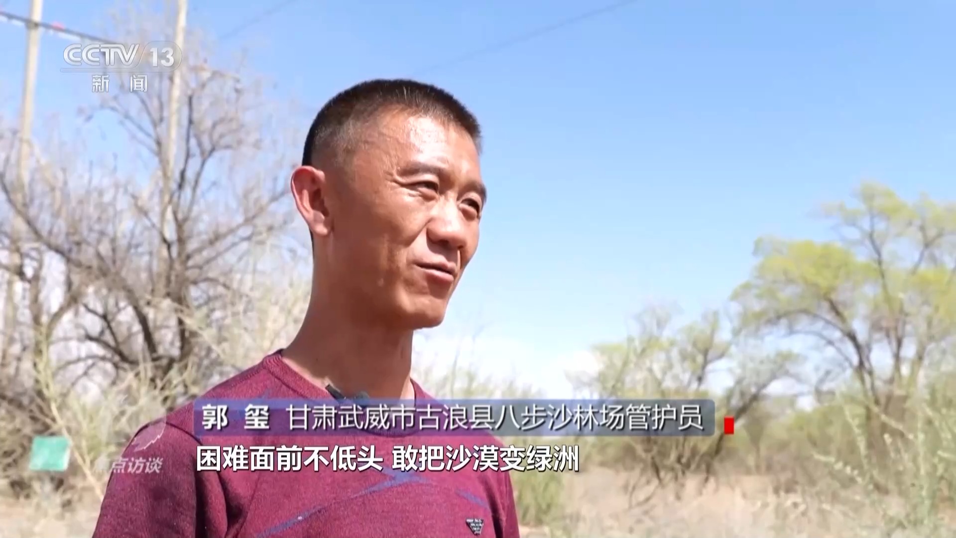 甘肅武威市古浪縣八步沙林場管護員 郭璽:總書記跟我說,困難面前不低頭,敢把沙漠變綠洲。我們要一代一代傳承下去,我爺爺他們幾十年種下的樹不能到我們手里死掉。