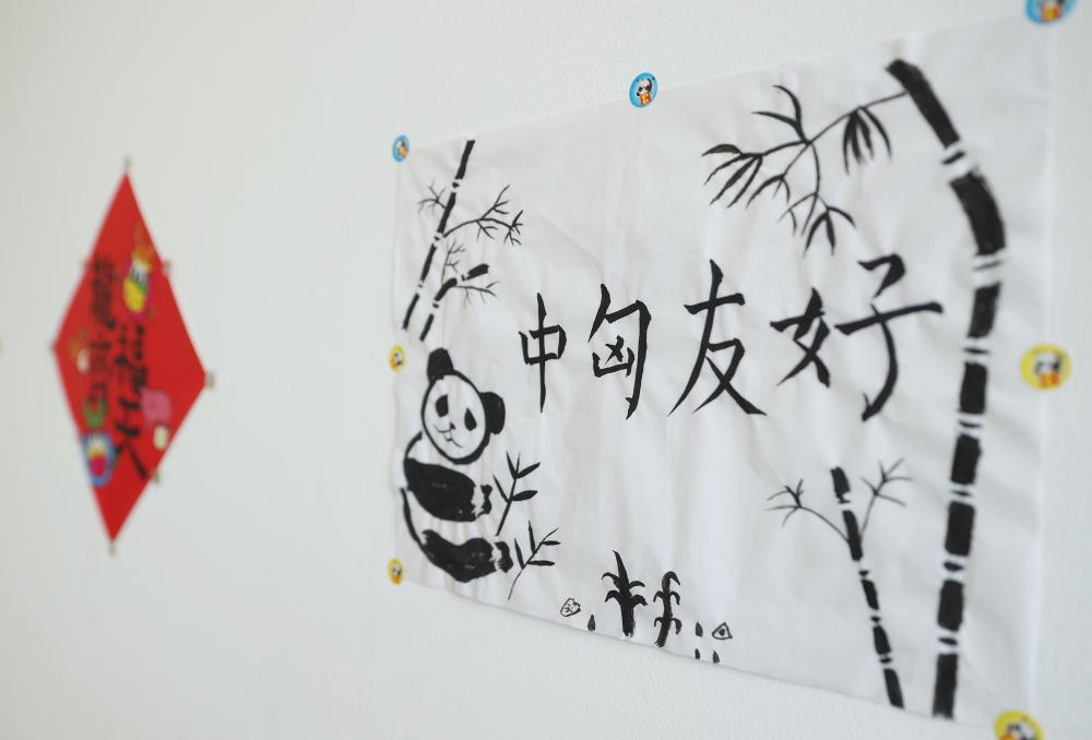 寫有“中匈友好”的小朋友畫作貼在匈中雙語(yǔ)學(xué)校教室墻上(2024年5月3日攝)。
