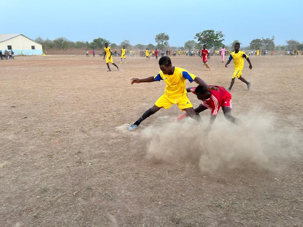 4月13日,貝寧當(dāng)?shù)卮迕袂騿T正在非洲“村超”賽場上踢球。受訪者供圖