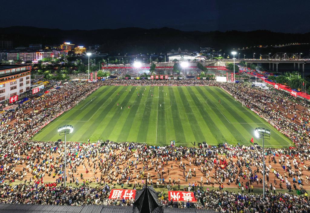 2023年7月1日,人們在觀看貴州“村超”足球賽(無人機(jī)照片)。新華社記者楊文斌攝