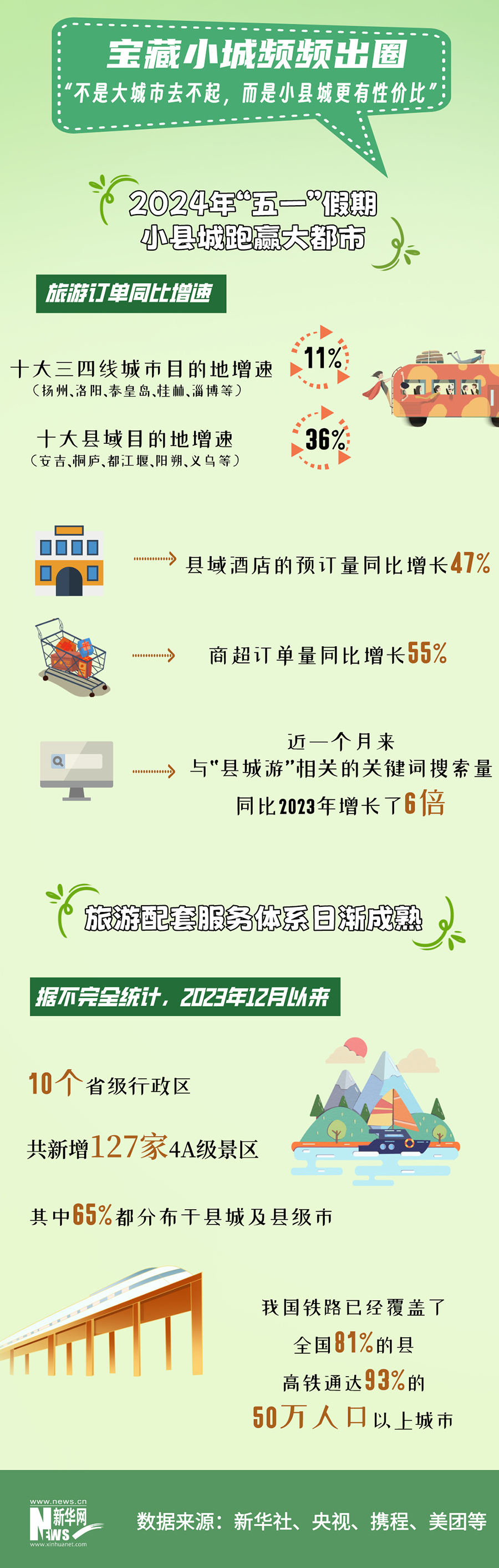 小城故事多。今年“五一”假期,熱門旅游城市和景點雖然依舊“人從眾”,但縣域旅游也展現(xiàn)出了極大的活力。文化和旅游部數(shù)據(jù)中心測算,縣城正在成為出游“新寵”,文旅下沉趨勢明顯。