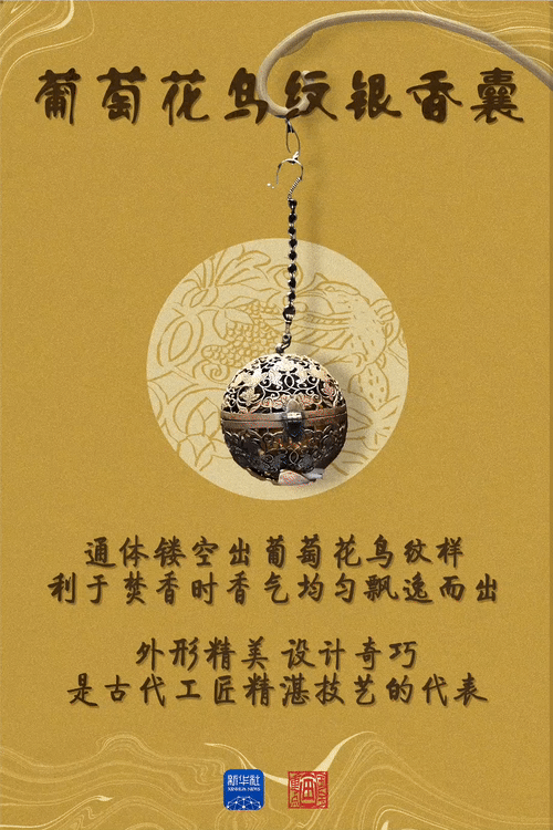葡萄花鳥紋銀香囊體現(xiàn)了唐代貴族的生活意趣?!疤拼鐣?huì)的開放包容,人們生活中的儀式感都融入在這枚香囊之中。”陜西歷史博物館副研究館員賀達(dá)炘說。