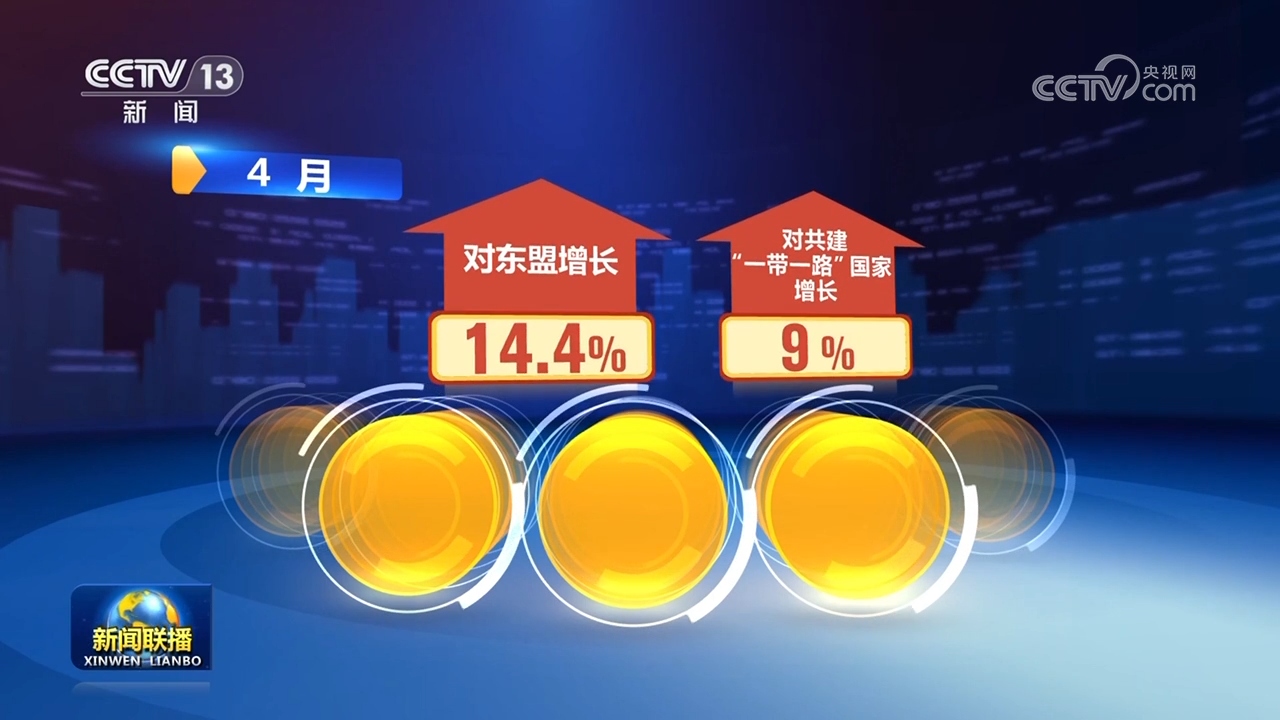 從市場看,我國對傳統(tǒng)和新興市場的貿(mào)易都呈現(xiàn)出增長態(tài)勢。4月,受庫存消化、需求恢復(fù)等因素帶動,中國對傳統(tǒng)市場進(jìn)出口由降轉(zhuǎn)增,其中,對歐盟增長3.3%,對美國增長6.2%。與此同時(shí),對新興市場進(jìn)出口繼續(xù)保持較高增速,對東盟、共建“一帶一路”國家分別增長14.4%、9%。