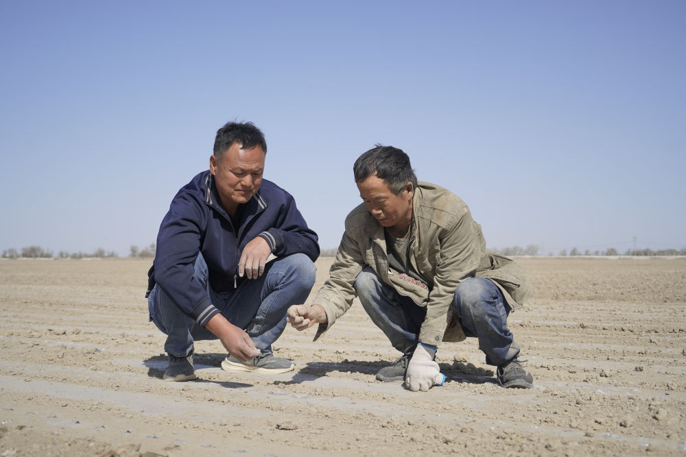 2024年4月23日,雙泉農(nóng)業(yè)專業(yè)合作社負責(zé)人何洪濤(左)在棉田里工作。