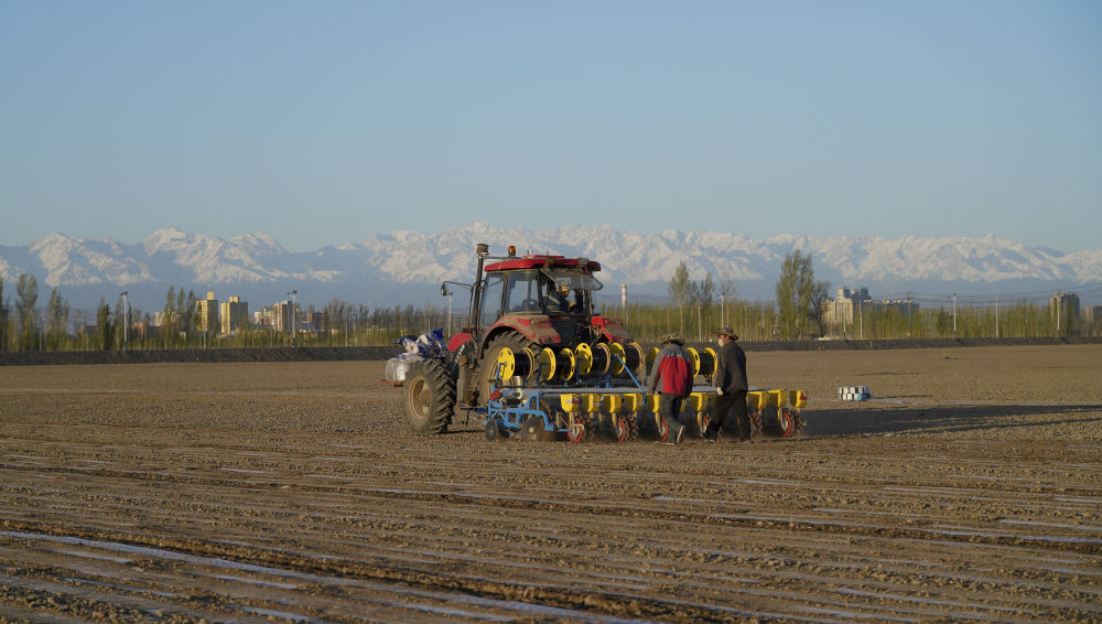 從哈衣繞拉管理的棉田向南望去,可見綿延起伏的天山山脈,終年不化的積雪、線條硬朗的山脊、若隱若現(xiàn)的云杉,像一幅氣勢磅礴的風(fēng)景畫。一臺高大的機器正按照北斗導(dǎo)航設(shè)計的路線筆直地行進,車尾安裝的自動化播種設(shè)備將透明的薄膜、黑色的滴灌帶、紅色的包衣棉籽,一并整齊地埋進褐色的泥土里。