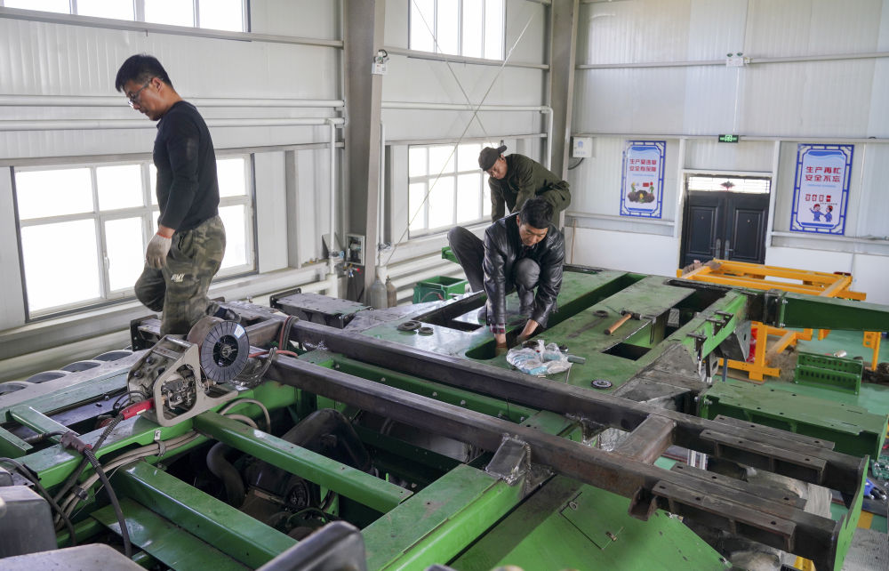2024年4月18日,在新疆沙灣市,工作人員在韓波的農(nóng)機專業(yè)合作社改裝農(nóng)機。