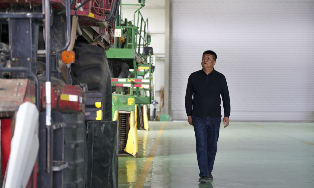 2024年4月18日,在新疆沙灣市,韓波在農(nóng)機專業(yè)合作社車間查看農(nóng)機。