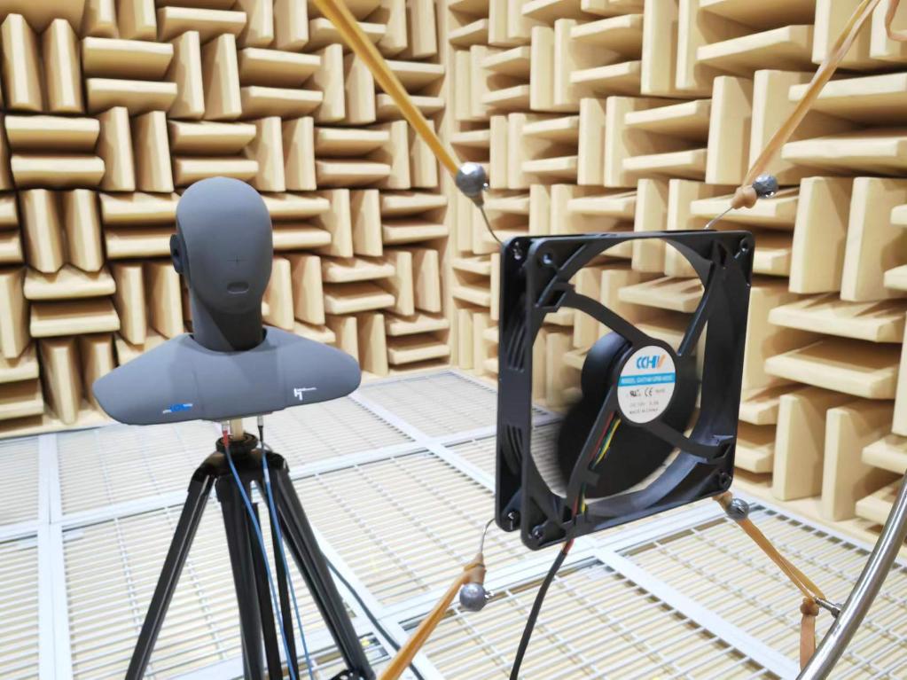 5月19日,晟輝科技實(shí)驗(yàn)室內(nèi),一款風(fēng)機(jī)正在接受噪音檢測。新華社記者謝?,?攝