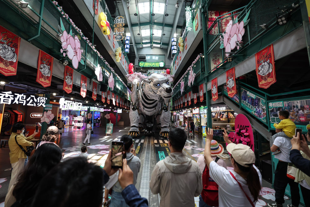 大連熊洞街,當身高6米、重達25噸,灰色的仿生機械巨熊時而張口咆哮,時而緩緩前行,游客爆發(fā)出陣陣歡呼。大連冰山慧谷發(fā)展有限公司總經(jīng)理助理藍費靜說:“這一街區(qū)由擁有近百年歷史的大連冰山集團舊址改造而來,現(xiàn)已匯聚上百家游樂、電玩、研學商戶,老廠房煥發(fā)了新生機?!?/p>