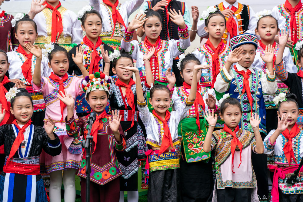 “咿唔瑟,咿唔瑟,吸噶拉羅,哈賽賽,賽哩羅作搓……”(歌詞大意為:巧遇大家來唱歌喲)視頻連線的另一邊,隨著哈尼族兒歌《阿密策》響起,38名身著苗、瑤、傣、哈尼族等民族服飾的同學(xué)們,將歡快的歌聲獻給“奧比昂爺爺”。