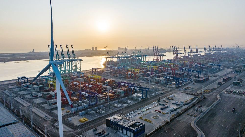 看似平常的碼頭作業(yè),背后卻另有玄機(jī)——整個過程達(dá)到了“零碳”排放。2021年底,隨著兩臺風(fēng)機(jī)葉片緩緩啟動,這座全球首個“智慧零碳”碼頭的智慧綠色能源系統(tǒng)開始并網(wǎng)發(fā)電,通過風(fēng)電、光伏發(fā)出的綠色能源,源源不斷為碼頭生產(chǎn)提供能源。