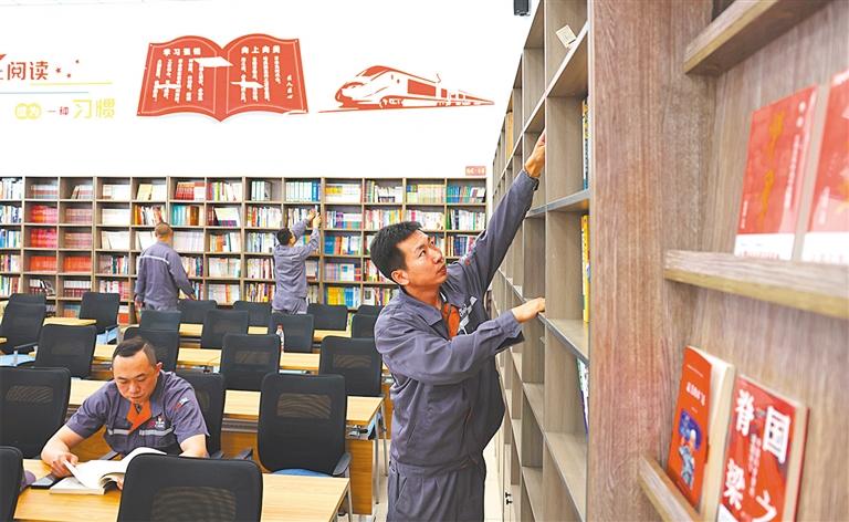 ▲5月28日,中車長客職工書屋,周晶輝國家技能大師工作室成員利用休息時間忙“充電”。