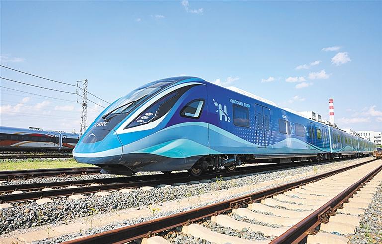 ▲5月28日,中車長客研制的全國首列氫能源市域列車。該車已于近期成功完成達速試跑,標志著氫能在軌道交通領域的應用取得歷史性突破。