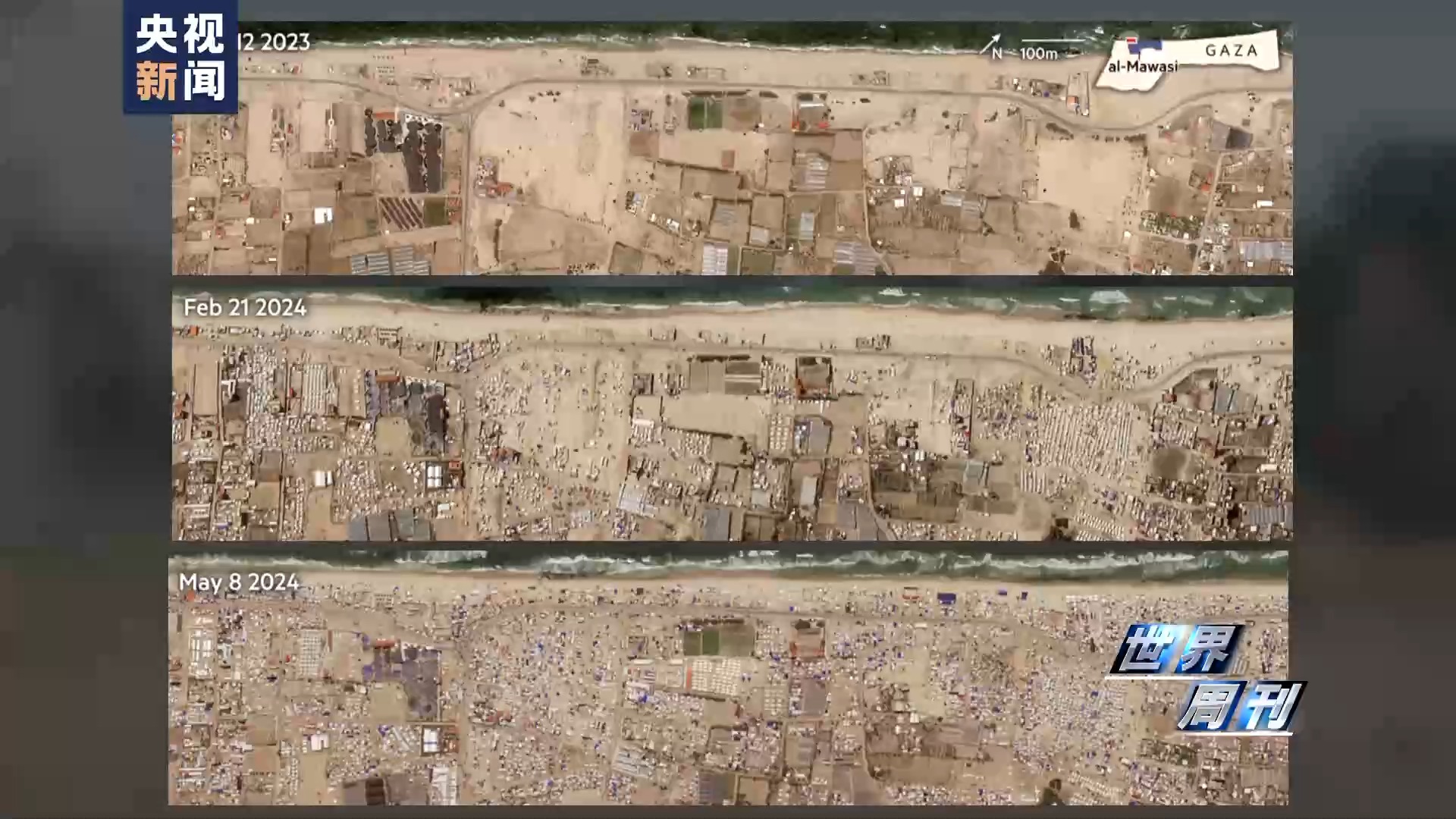 最新的衛(wèi)星圖像顯示,這些人道主義區(qū)域布滿了帳篷和塑料布搭建的臨時(shí)建筑,甚至一路延伸到沙灘上,最近的一排距離大海只有幾步之遙。