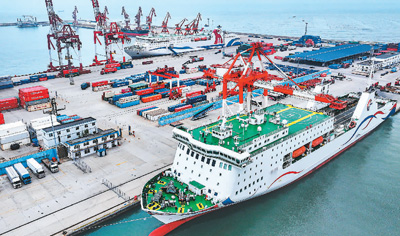 今年以來,山東省榮成市石島管理區(qū)通過推廣“海運(yùn)直航+跨境電商+海外倉(cāng)”等發(fā)展模式,全力做好貨物承攬。圖為日前,石島新港口岸,貨輪在裝卸集裝箱貨物。